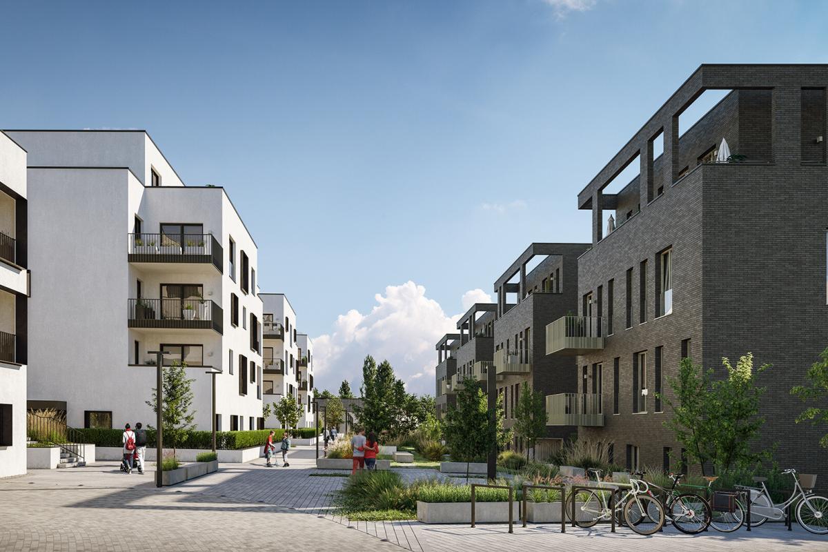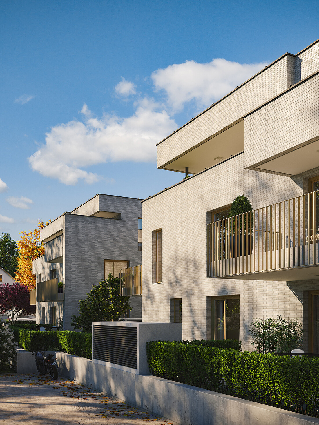 In der rückliegenden Wohnbebauung werden die Baukörper parallel zueinander angeordnet. Vor- und Rücksprünge an den einzelnen Gebäuden gliedern unterschiedliche Fassadenbereiche und lockern die Volumina auf. Das fassadenbildende Hauptmerkmal bilden quadratische Fensteröffnungen, die wir hier in unterschiedlichen Größen vorsehen. Um die quadratische Grundform weiterhin zu betonen, werden die Fenster teilweise mit Laibungsrahmen aus Metall akzentuiert.