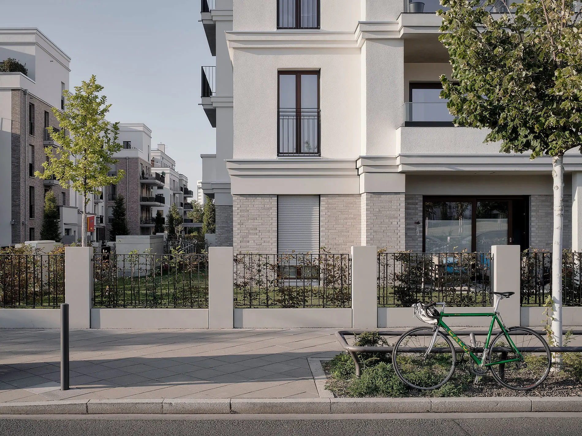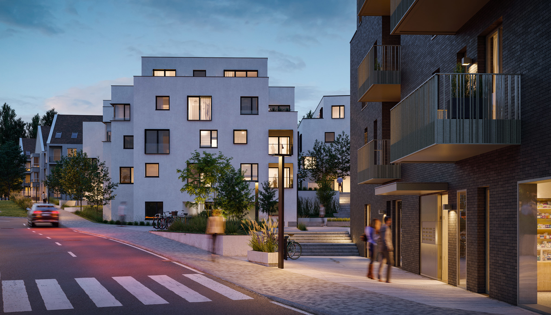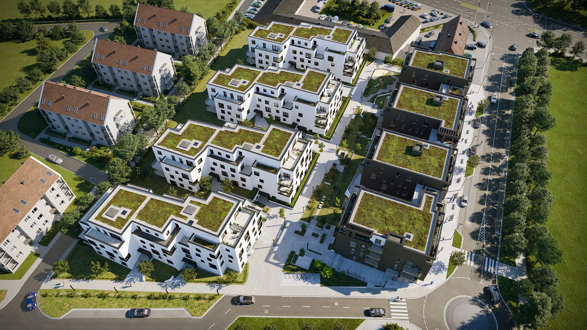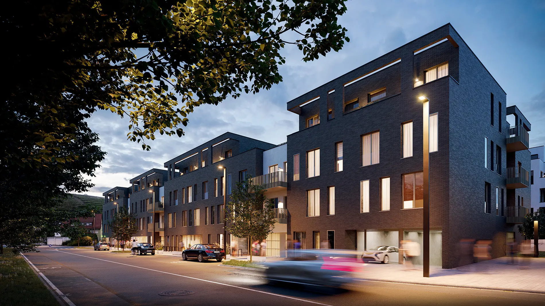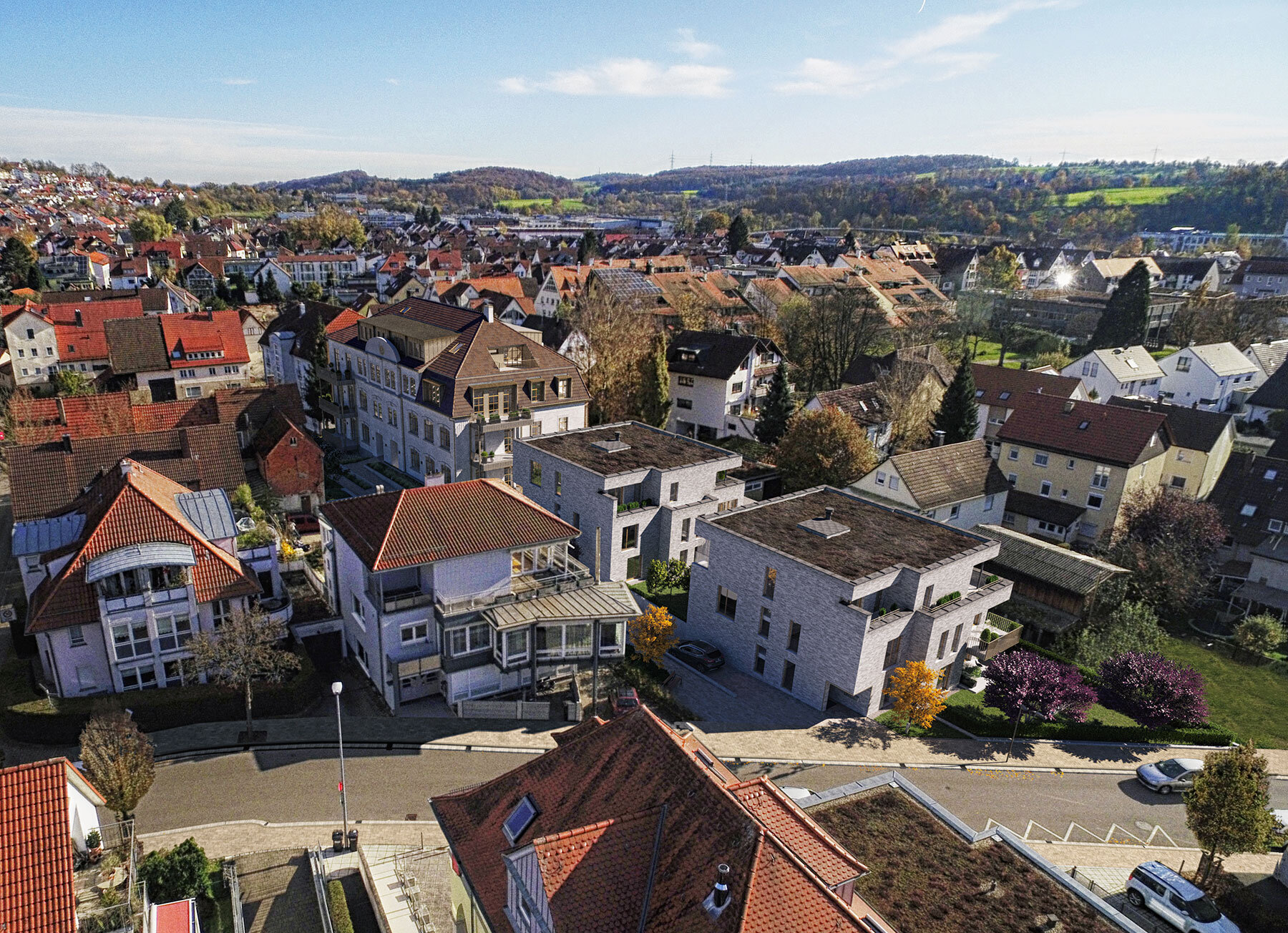 Die geschlossene Randbebauung entlang der Hofener Straße weist ein viergeschossiges Gebäude mit einer Mischnutzung von Gewerbe und Wohnen vor. In der rückliegenden Bebauung befinden sich vier Baukörper, die ebenfalls vier Geschosse und abweichend jedoch eine reine Wohnnutzung anbieten. Die Zugänge dieser Wohngebäude befinden sich an der Spielstraße, die in Quartiersmitte als Treffpunkt für Jung und Alt das pulsierende Herz unserer Anlage darstellt und eine attraktive Sicht auf die direkt angrenzenden Weinberghänge bietet.
