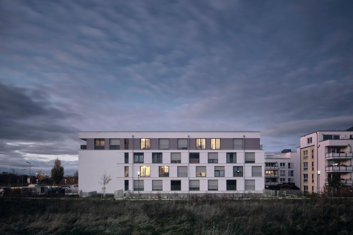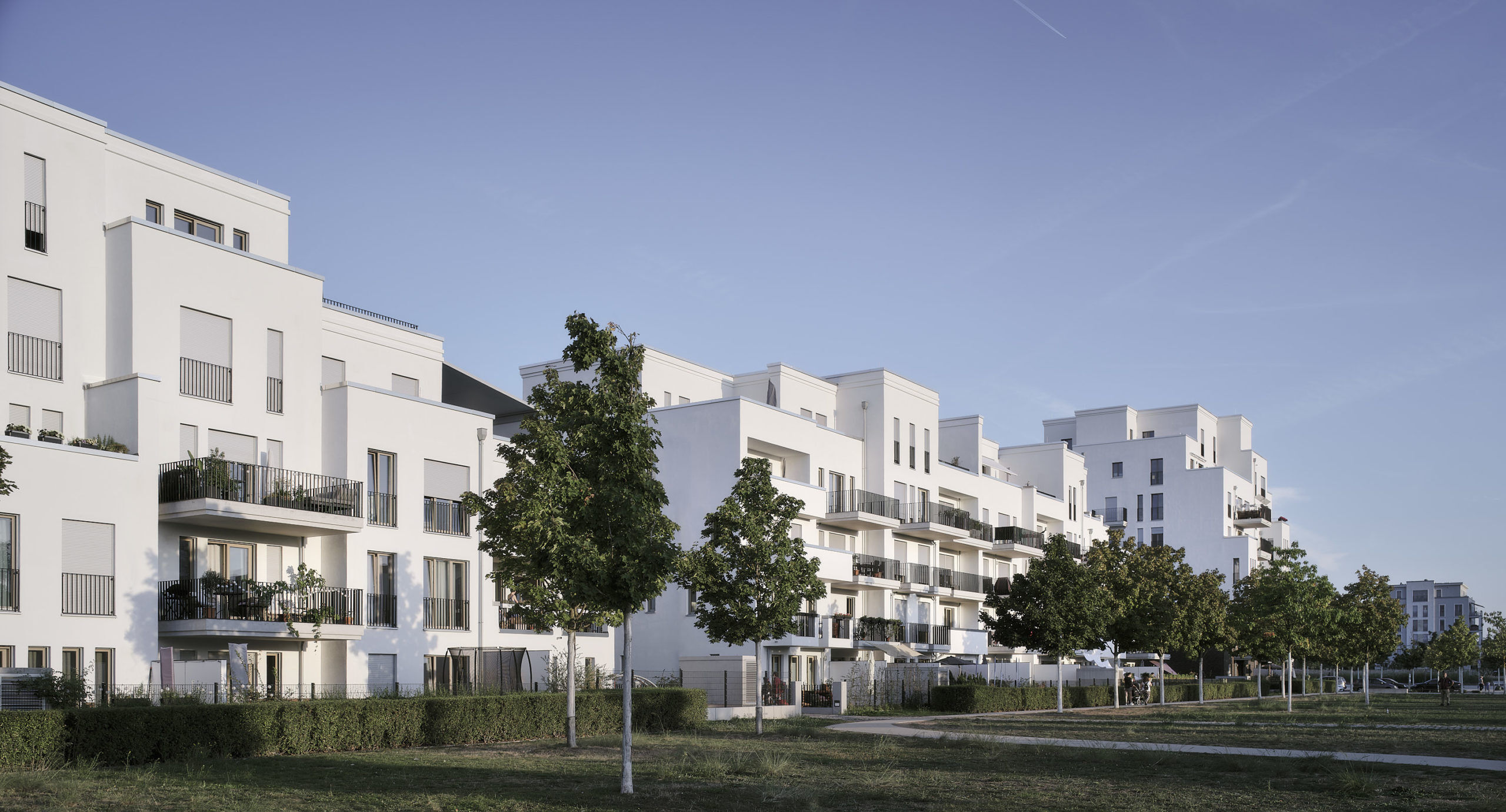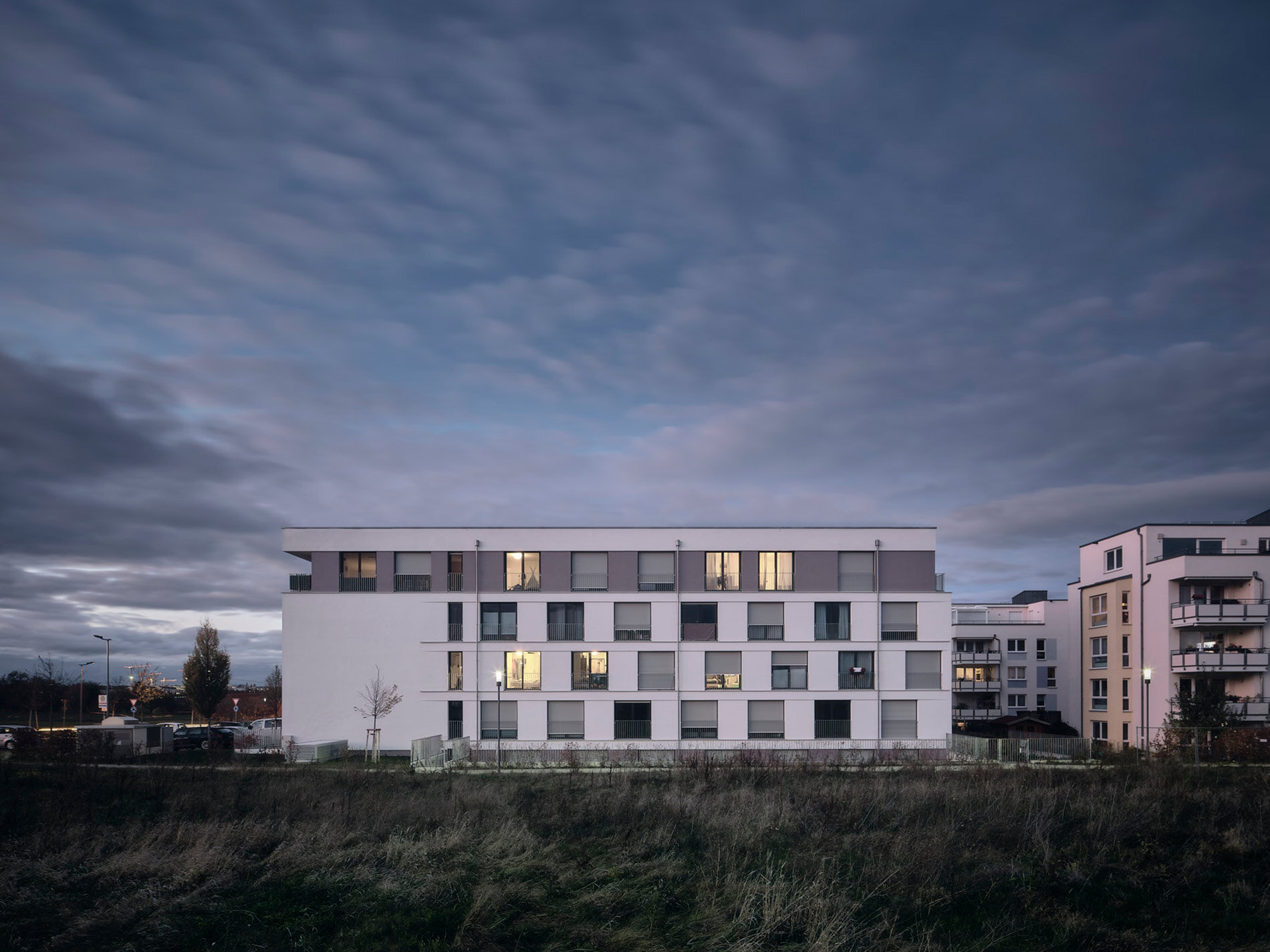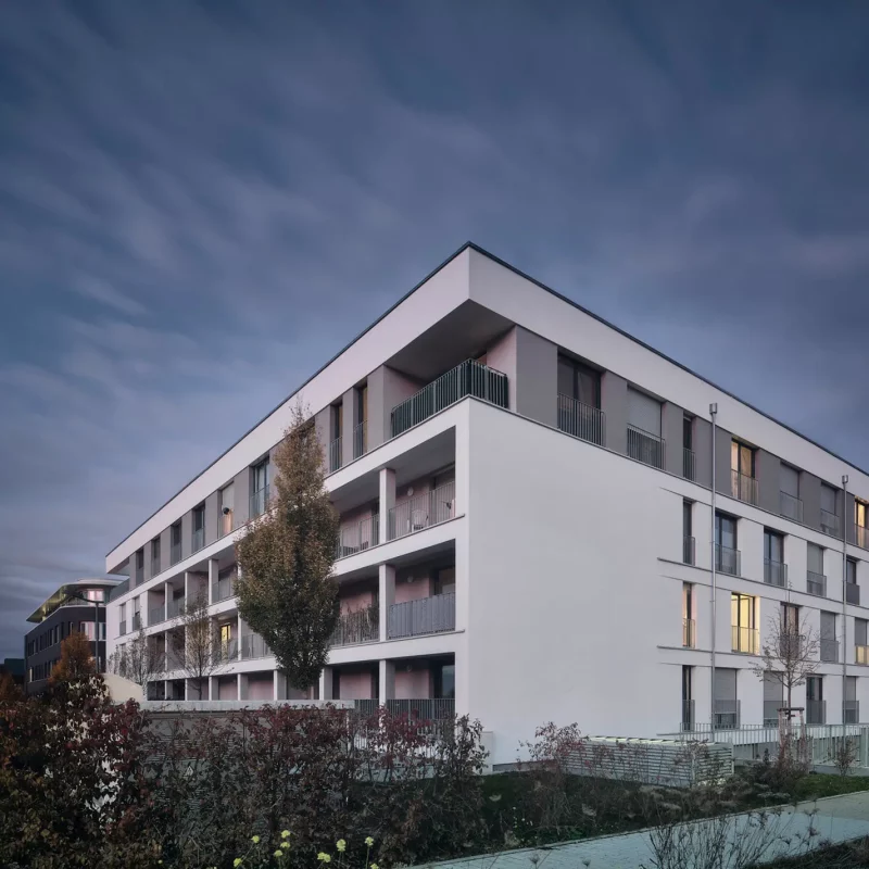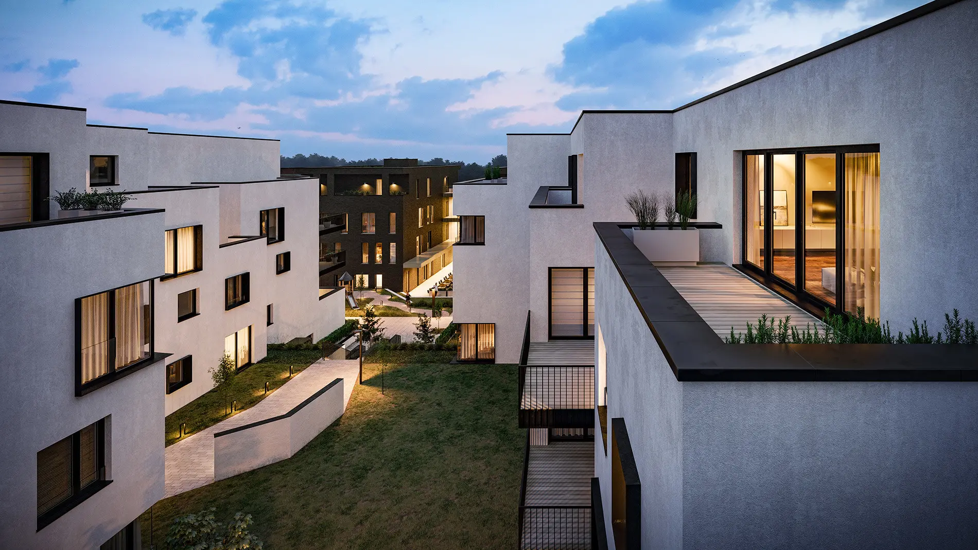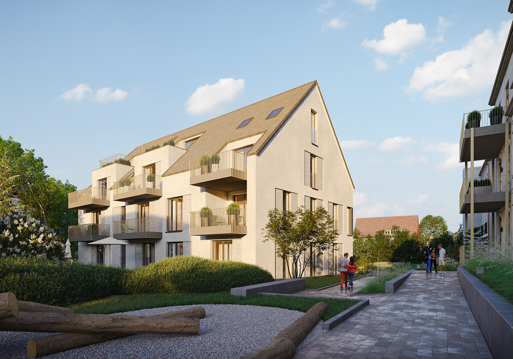 Die geschlossene Randbebauung entlang der Hofener Straße weist ein viergeschossiges Gebäude mit einer Mischnutzung von Gewerbe und Wohnen vor. In der rückliegenden Bebauung befinden sich vier Baukörper, die ebenfalls vier Geschosse und abweichend jedoch eine reine Wohnnutzung anbieten. Die Zugänge dieser Wohngebäude befinden sich an der Spielstraße, die in Quartiersmitte als Treffpunkt für Jung und Alt das pulsierende Herz unserer Anlage darstellt und eine attraktive Sicht auf die direkt angrenzenden Weinberghänge bietet.