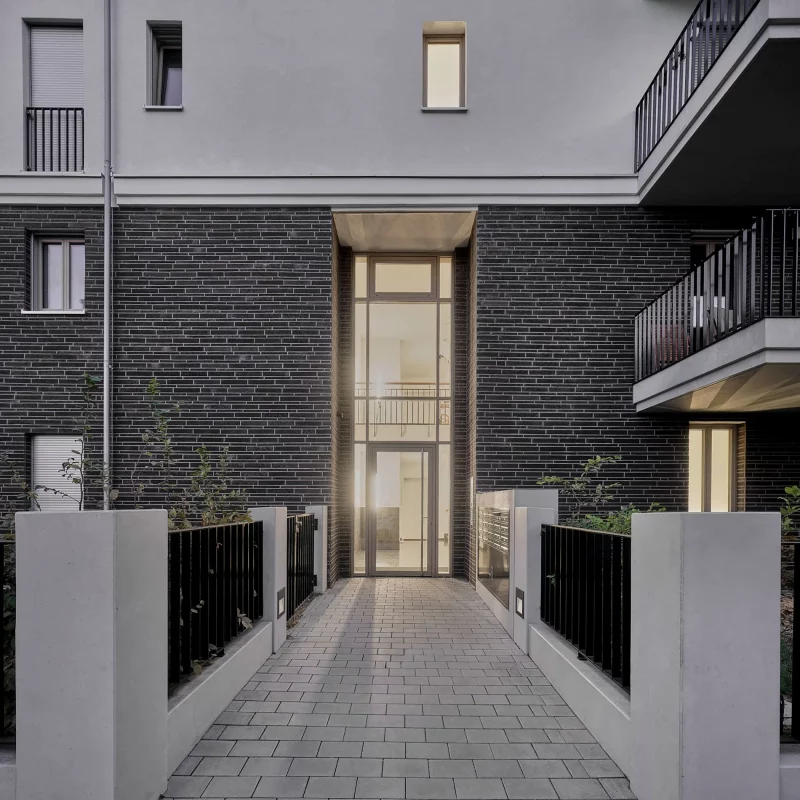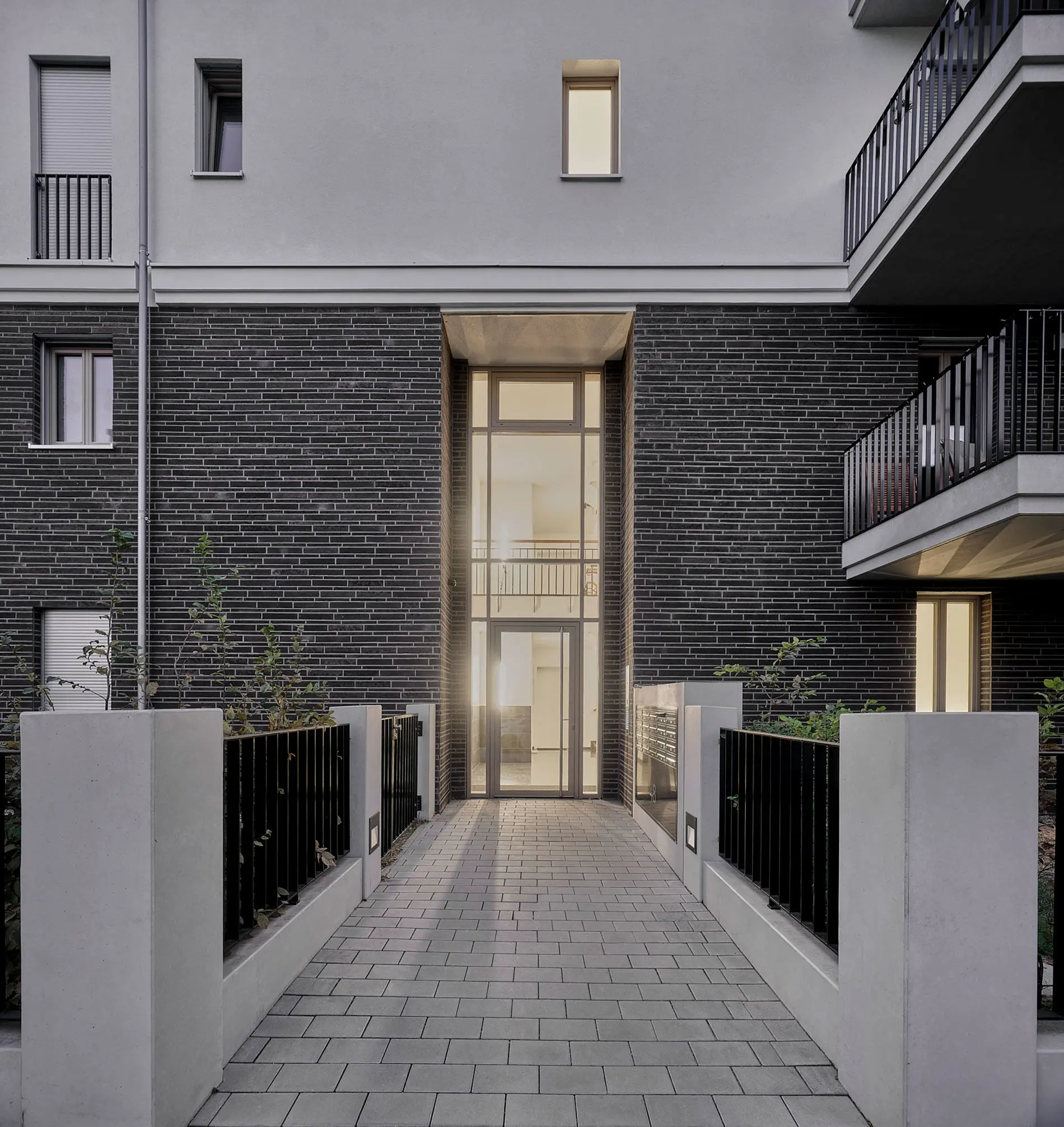 Entlang der Hofener Straße wird der lange und geschlossene Baukörper durch die geschickte Anordnung von Rück- und Höhensprüngen immer wieder unterbrochen, wodurch eine gleichmäßige Rhythmik entsteht und die Zugänge bewusst betont werden. Für die Fassadengestaltung wählten wir vornehmlich stehende und geschosshohe Aluminium-Lochfenster mit einem hellen Eloxal-Farbton. Als Fassadenmaterial wurden raue und erdtönige Klinker gewählt, die einen angenehmen Kontrast zur seidigen Oberfläche der Fensterelemente bieten.