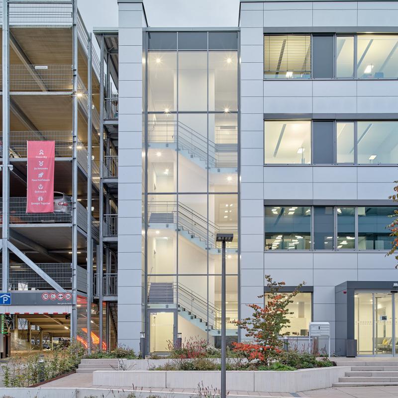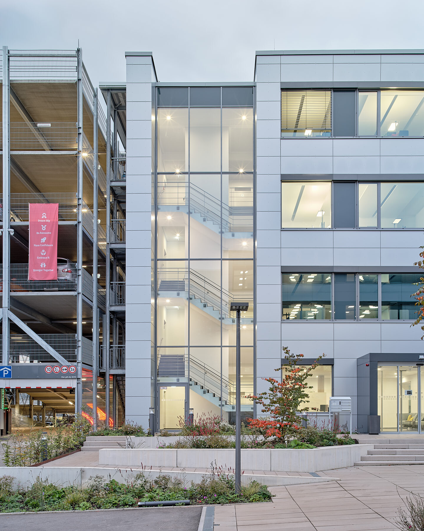 Neben der Erweiterung des Bürogebäudes wurde ein Parkhaus von uns geplant, welches über einen direkten Anschluss an das Bürogebäude verfügt.