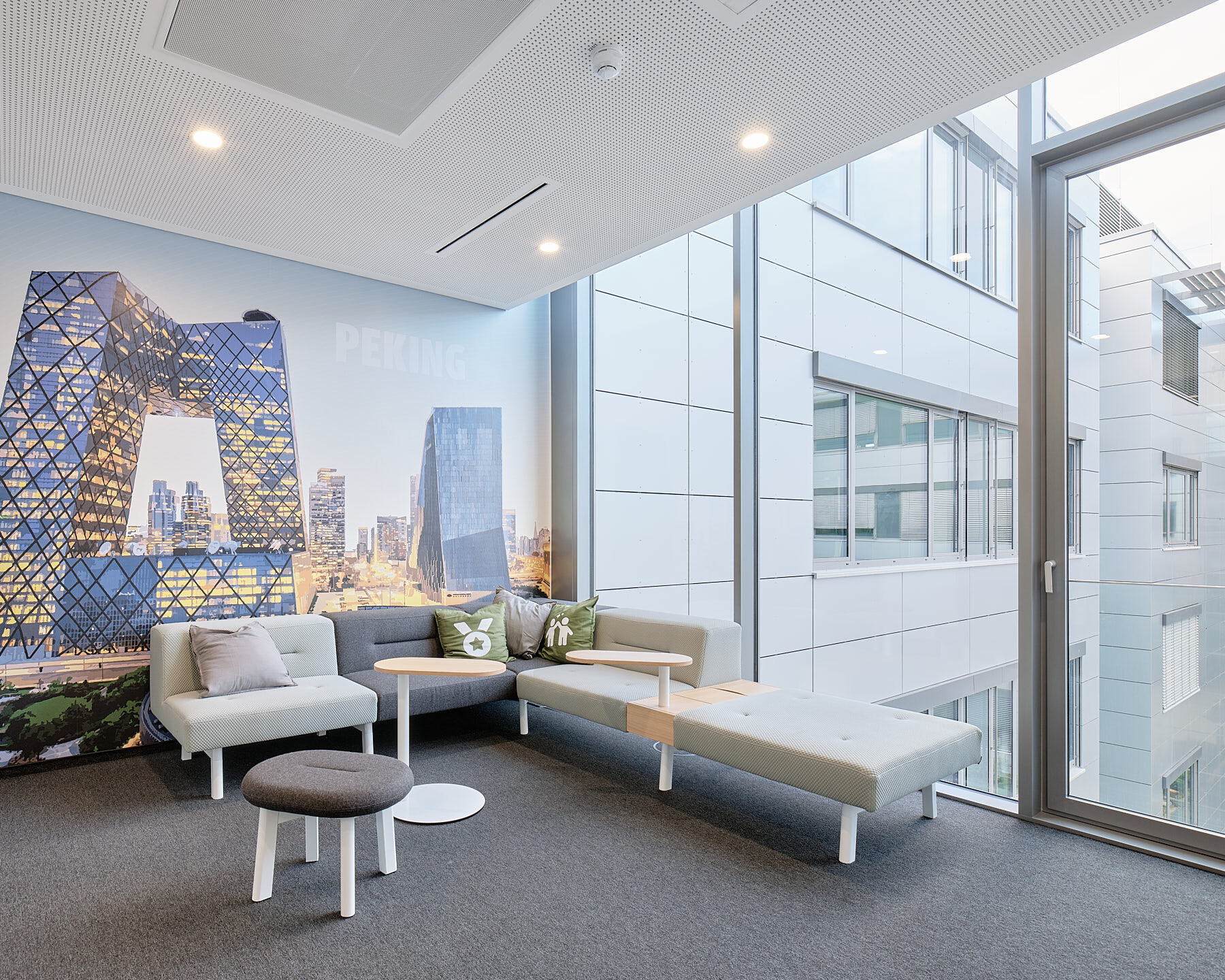 Durch spannende Raumabfolgen und ein durchdachtes Möblierungskonzept gelang es, Zonierungen mit Gestaltungselementen wie vertikalen Holzstrukturen und interessanten Sichtbezügen zu schaffen. An den Arbeitsplätzen bieten sich Rückzugsorte für konzentriertes Arbeiten, während gleichzeitig jederzeit die Möglichkeit besteht, die Weite des Raumes und das große Ganze wahrzunehmen.