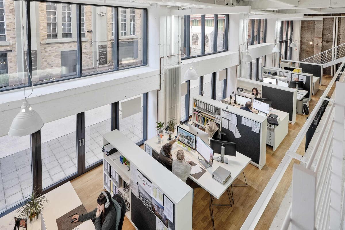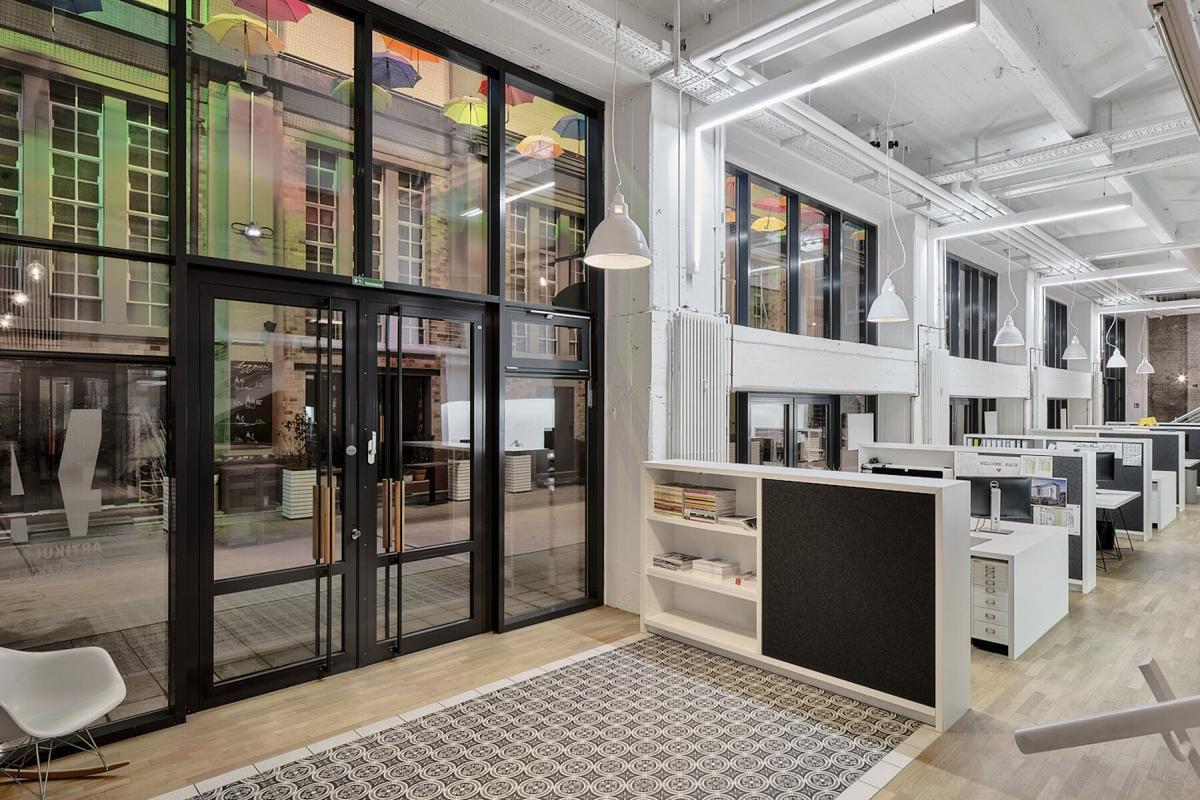 Die Fläche besticht nun durch ihr klares Design und ihr außergewöhnliches Raumgefühl, das durch den Hallencharakter und die zweigeschossig verglaste Front geprägt ist. Besonders die Verglasung, die sich über die gesamte Raumlänge erstreckt, verbindet und verschmilzt das bunte Leben im Innenhof des „Dick-Centers“ mit dem geschäftigen Treiben im Inneren der Agentur.