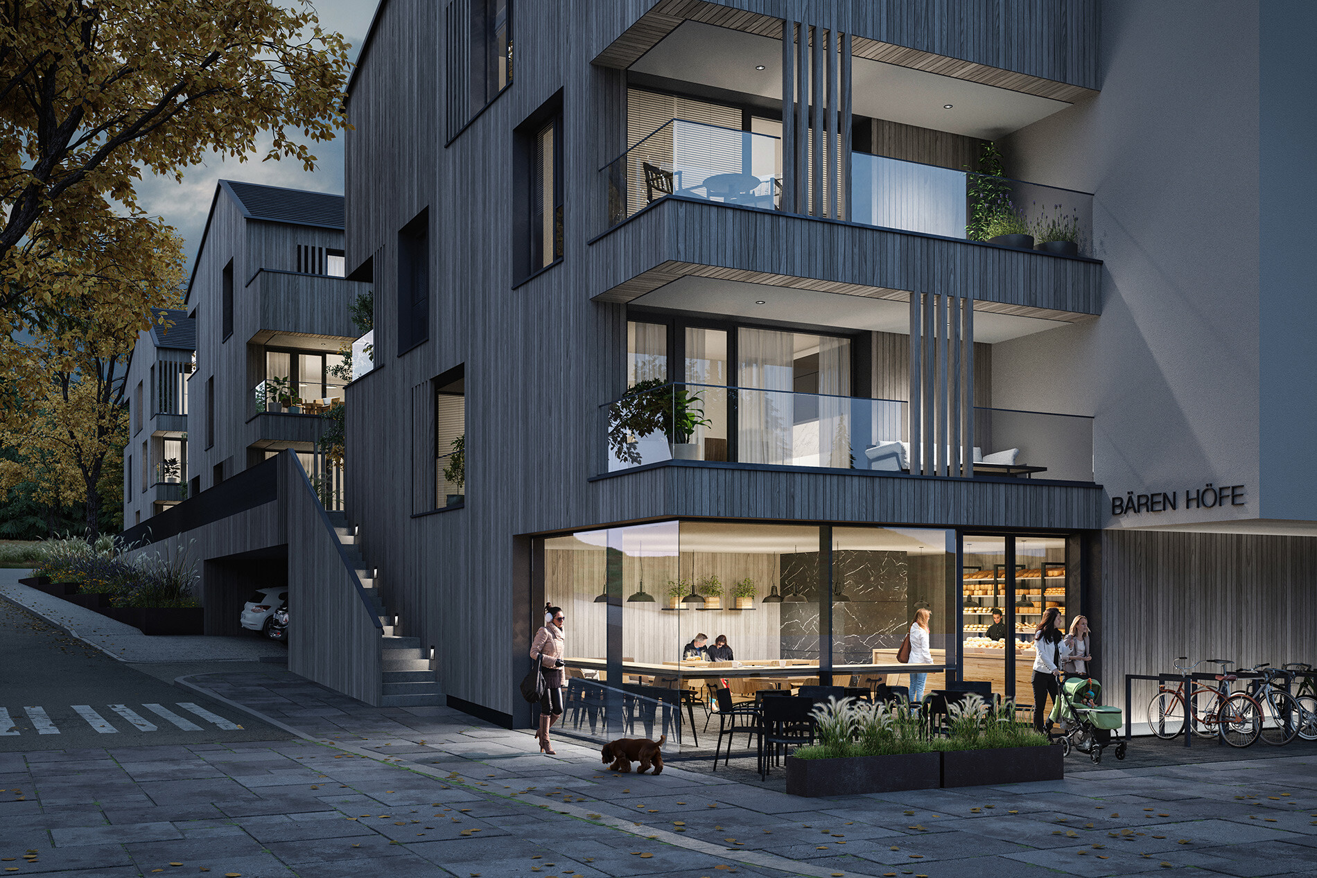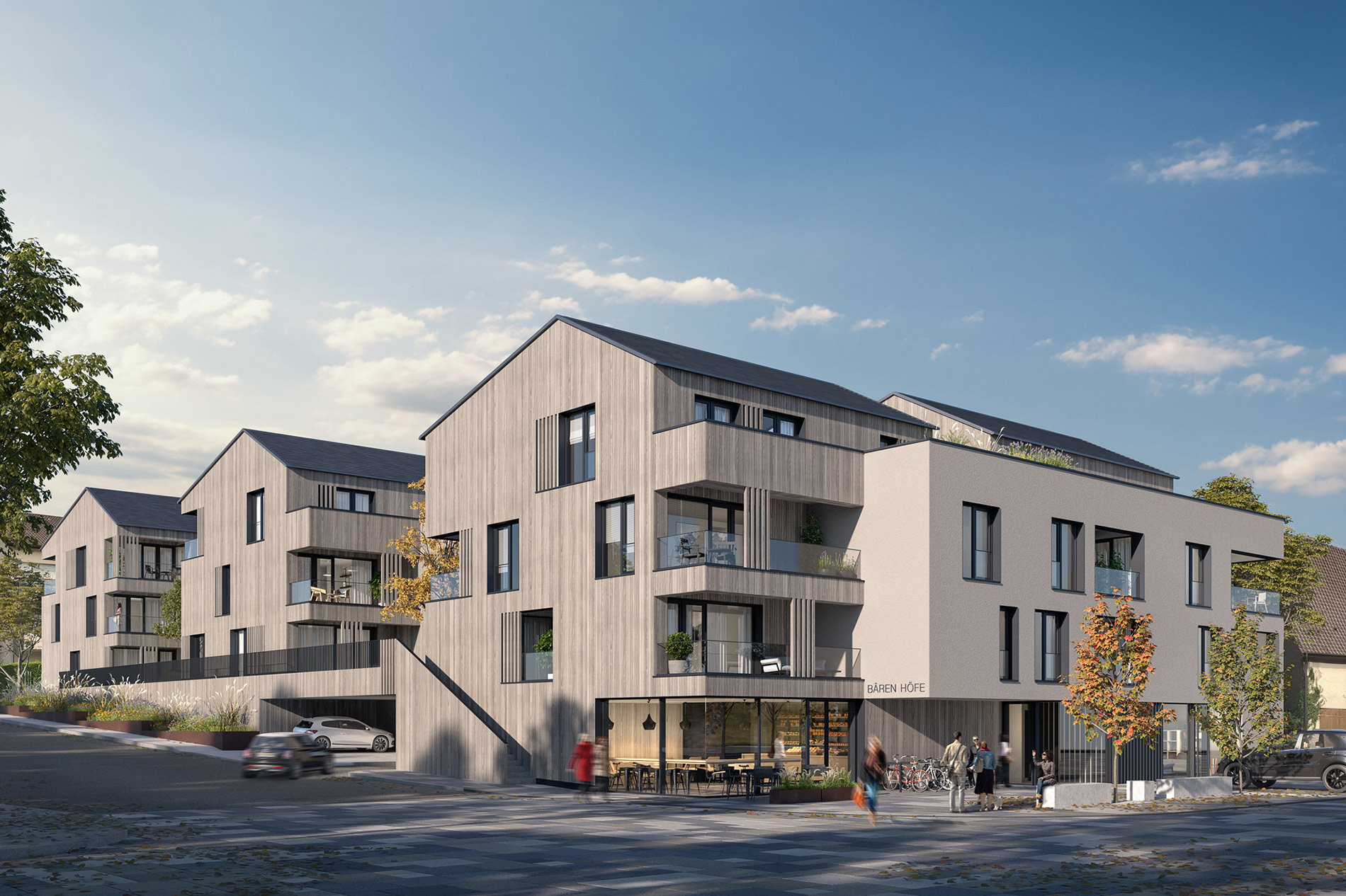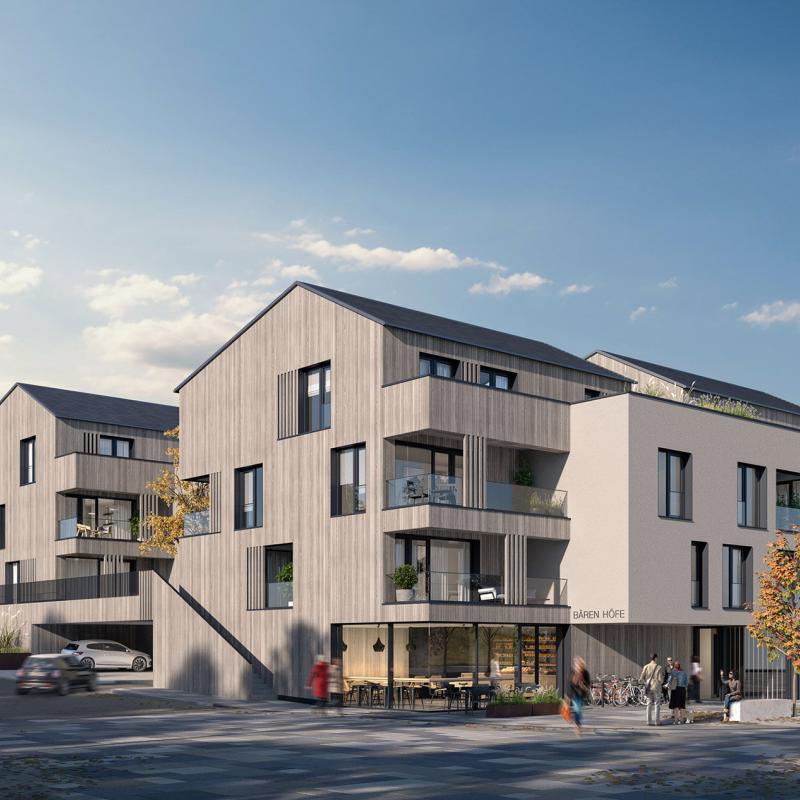 | Bärenhöfe | Neubau von zwei Mehrfamilienhäusern und einem Wohn- und Geschäftshaus in Holzbauweise mit gemeinsamer Tiefgarage. |