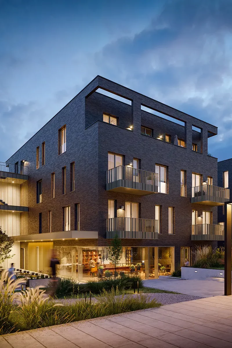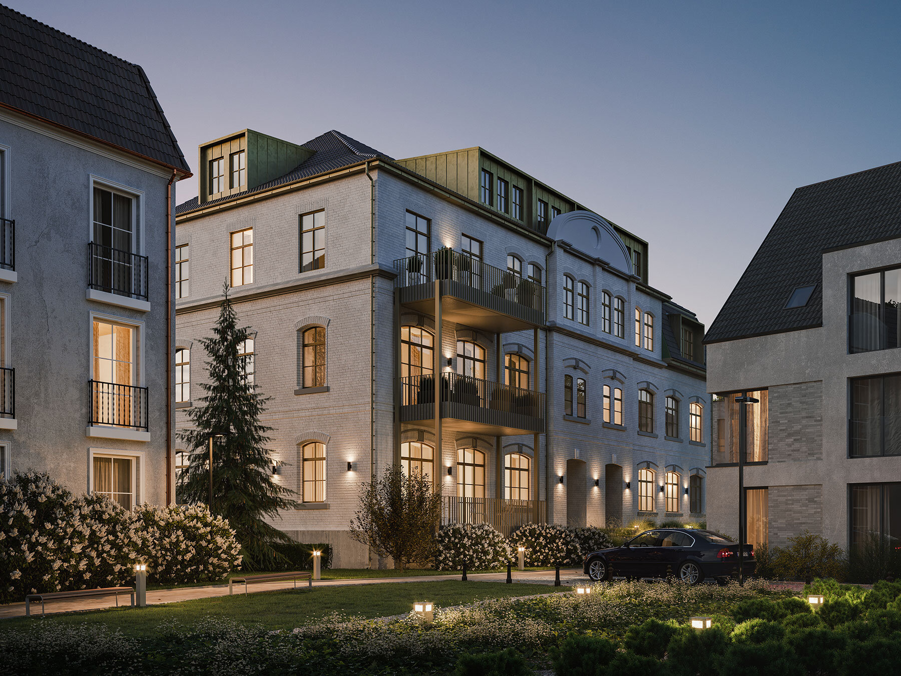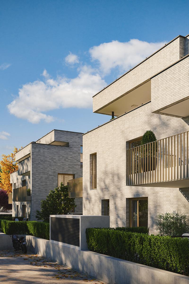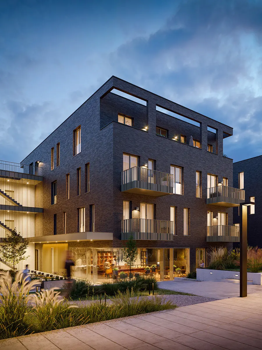 Die Neubauten bestehen jeweils aus zwei bis 3 Vollgeschossen und fügen sich harmonisch in die Umgebung ein. Ihre zeitlose Architektur greift die Klinkerfassade des alten Schulgebäudes auf, sodass ein stimmiges und selbstbewusstes Ensemble entsteht.