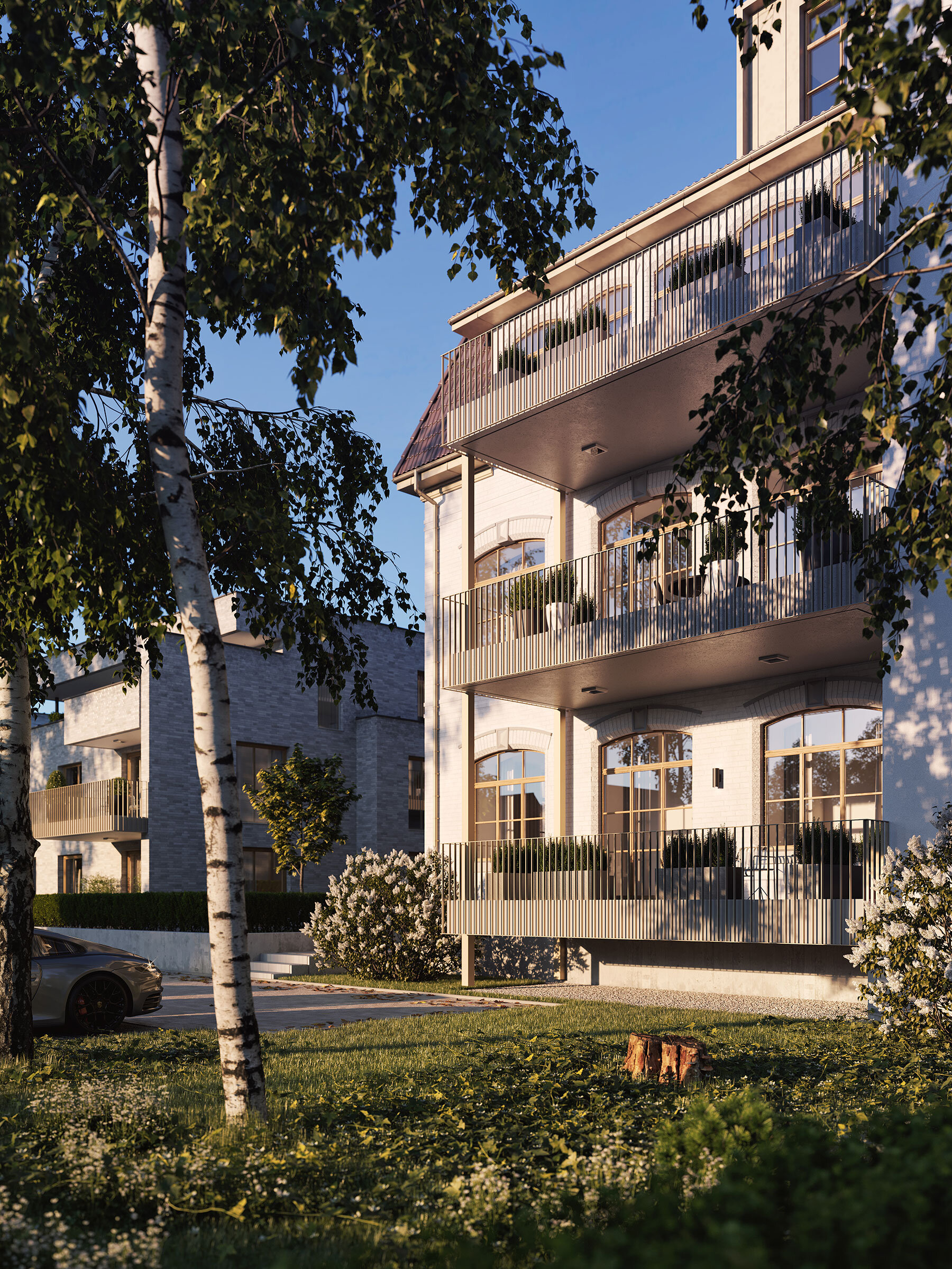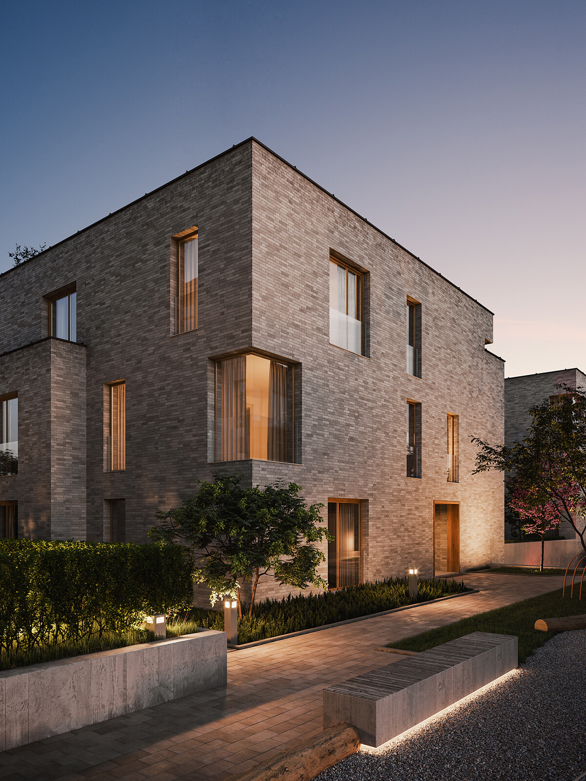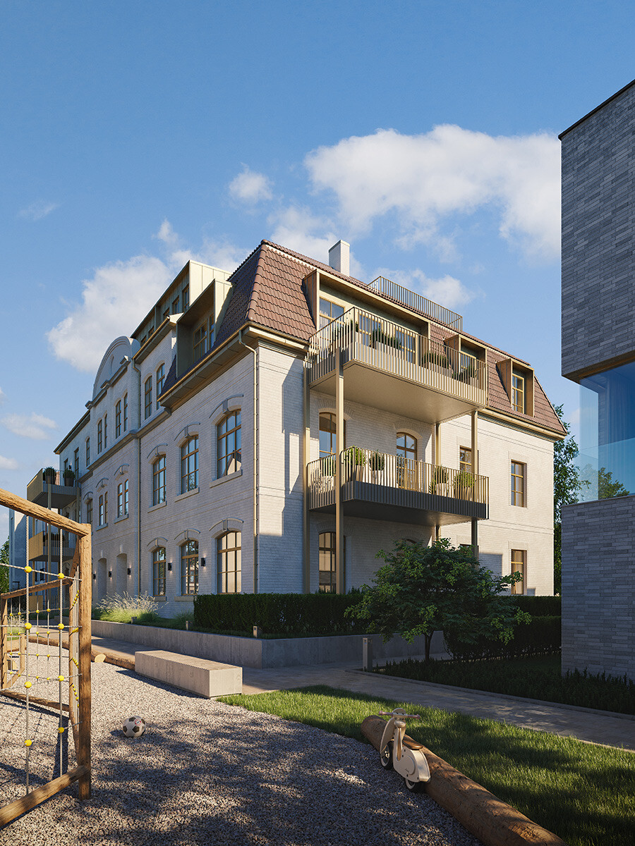 Die Neubauten bestehen jeweils aus zwei bis 3 Vollgeschossen und fügen sich harmonisch in die Umgebung ein. Ihre zeitlose Architektur greift die Klinkerfassade des alten Schulgebäudes auf, sodass ein stimmiges und selbstbewusstes Ensemble entsteht.