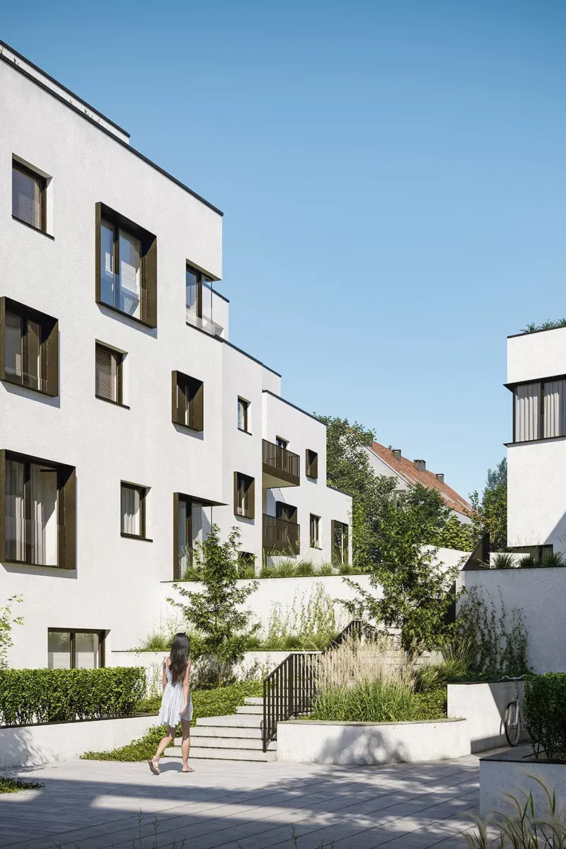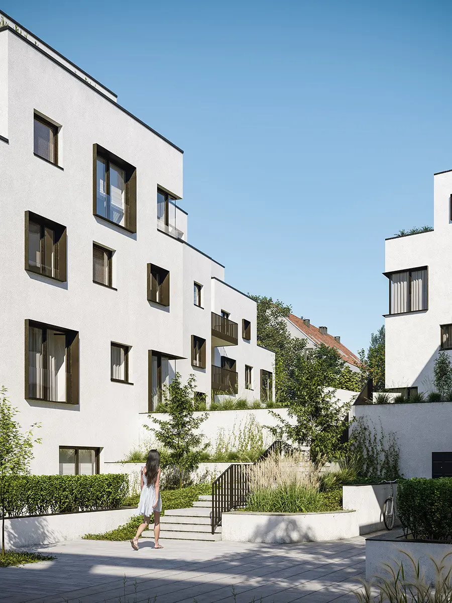Die städtebauliche Struktur basiert in den Grundzügen auf dem Siegerentwurf eines Architektenwettbewerbs, der bereits im Jahr 2008 durchgeführt wurde und eine geschlossene Randbebauung entlang der Hofener Straße sowie eine Wohnbebauung in zweiter Reihe bzw. sonniger und ruhiger Lage vorsieht. Wir haben aus dieser Grundlage heraus ein stimmiges Ensemble entwickelt, welches sich harmonisch in die nähere Umgebung einfügt.