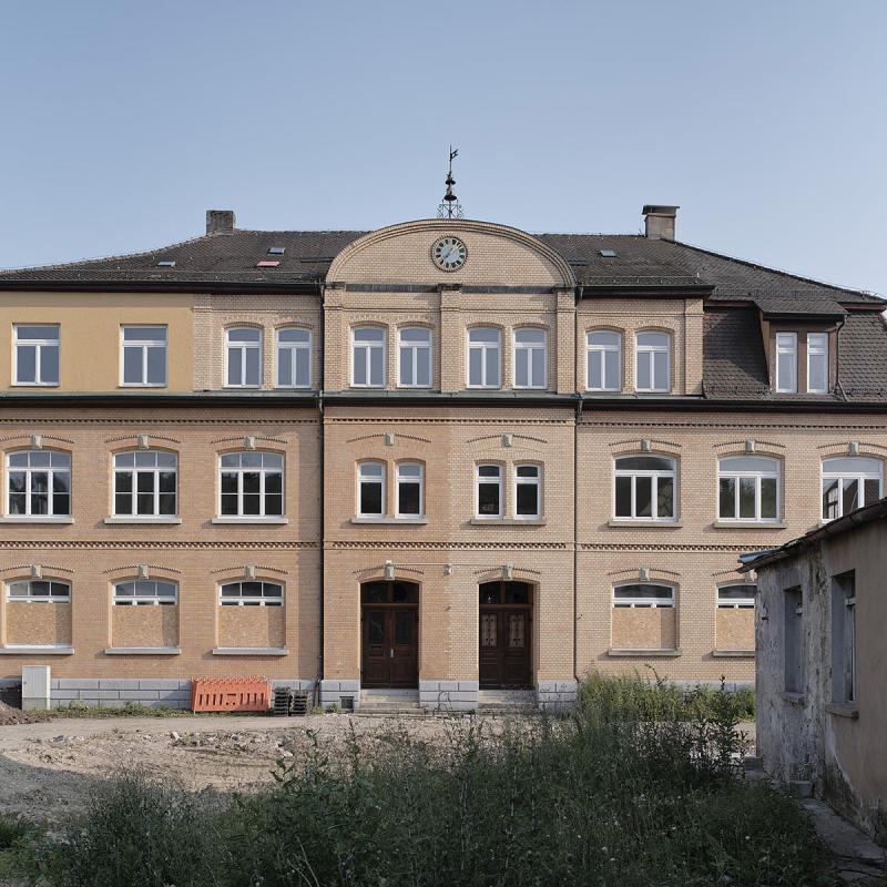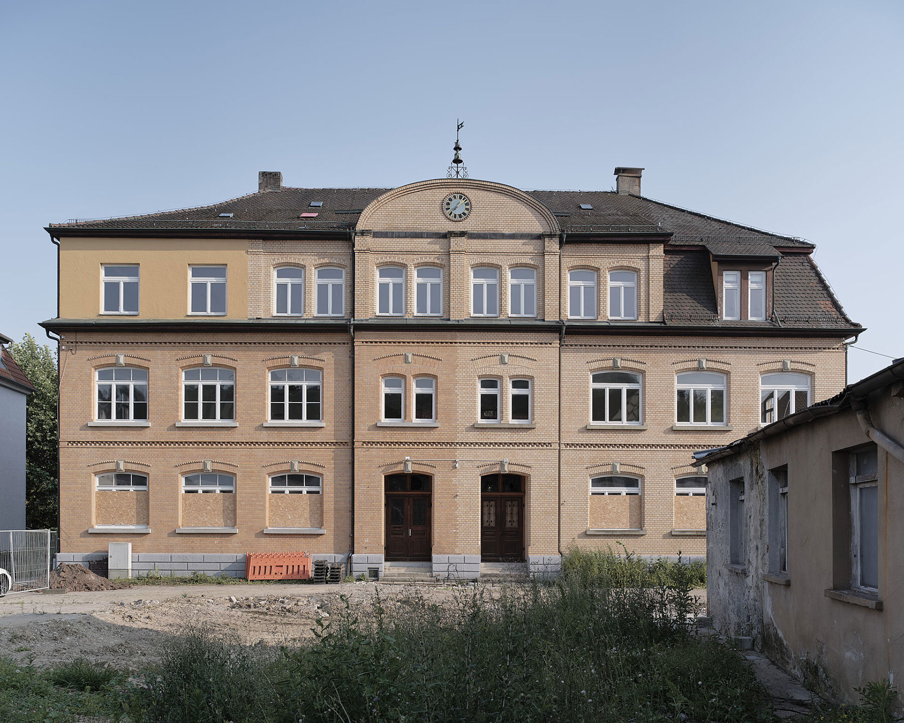 Im Rahmen eines Wettbewerbsverfahrens, an dem wir Architekten gemeinsam mit einem Investor teilnahmen, wurden wir mit der Erstplatzierung ausgezeichnet. Unser Entwurf sieht die Errichtung von drei neuen Mehrfamilienhäusern auf den Freiflächen neben dem Schulgebäude vor und konzentriert sich zusätzlich auf die behutsame Sanierung und Umnutzung des alten Schulgebäudes. Die ehemaligen Klassenzimmer werden in 14 barrierefreie Wohnungen umgewandelt, wodurch das Gebäude im Zentrum der Anlage zu einem wichtigen und identitätsstiftenden Quartiersgebäude wird.