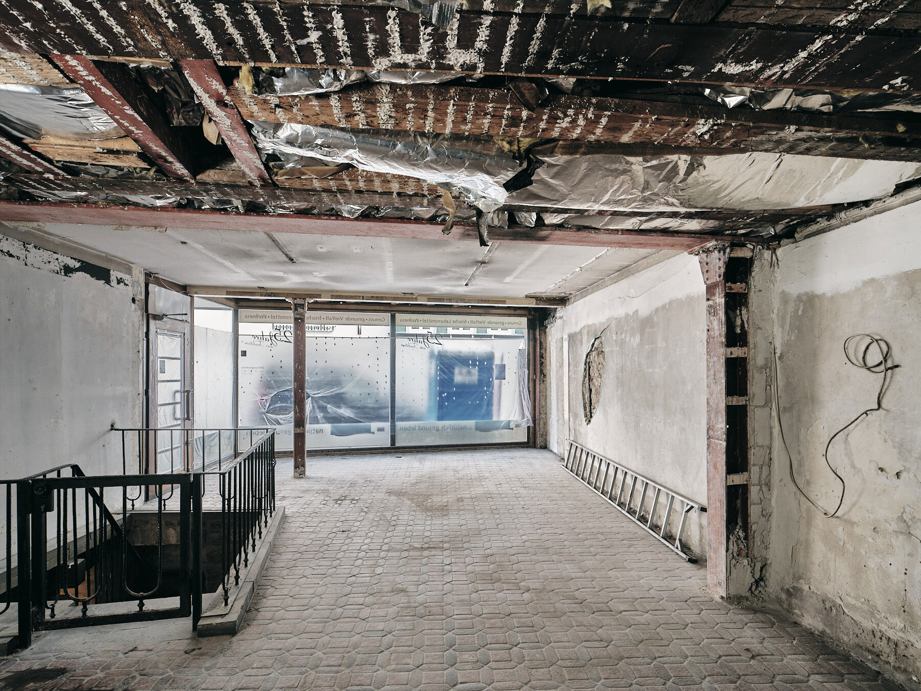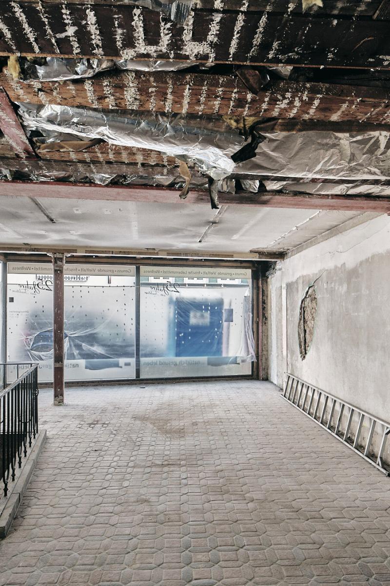 Als wir mit den Umbaumaßnahmen begannen, wurden zunächst sämtliche Verkleidungen entfernt, Zwischendecken abgebrochen und die Schaufensterverglasung durch den Maler mit Schutzfolien abgedeckt. Im zweiten Schritt wurden Wände, Decken, Rohre, Leitungen, Kabelkanäle und alles, was sonst noch im Raum montiert war, mit weißer Farbe übersprüht. Die Stahl- und Betonteile der Treppen und Geländer wurden weiß lackiert. Das Ergebnis war ein komplett neuer Raum – einladend, großzügig, freundlich und hell.