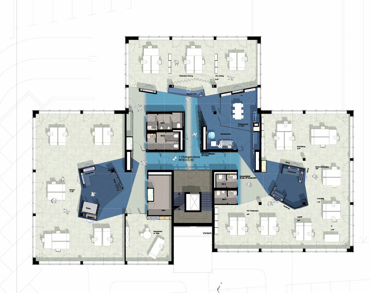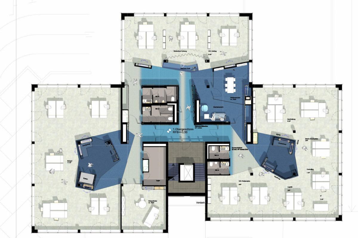 Die ursprünglichen Räumlichkeiten waren von Einzel- und Doppelbüros geprägt, ohne gemeinschaftlich nutzbare Räume zu berücksichtigen. Eine Herausforderung stellte die Aufteilung der Flächen auf zwei voneinander getrennte Büroflügel von je ca. 400 qm dar.